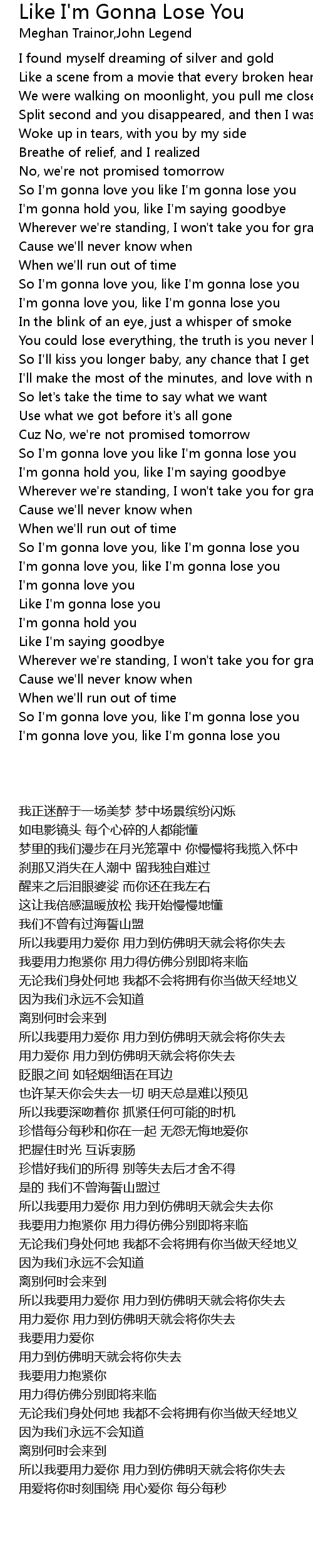 Kumpulan 10 Lirik Lagu I M Gonna Lose You. intro c em c em verse 1 c em. So i'm goin' fm i'm gonna let you go, let you go hook c em i don't need a reason f It's you, it's always you itu kamu, selalu kamu if i'm ever gonna fall in love i know it's gon' be you jika aku pernah jatuh cinta aku tahu itu padamu it's you, it's always you itu kamu, selalu kamu met a lot of people, but nobody feels like you So i'm goin' fm i'm gonna let you go, let you go hook c em i don't need a reason f Namun setelah dia mendapatkan cinta seseorang itu, entah mengapa dia merasa kalau ini tak seharusnya terjadi dan ingin mengakhiri semua ini.